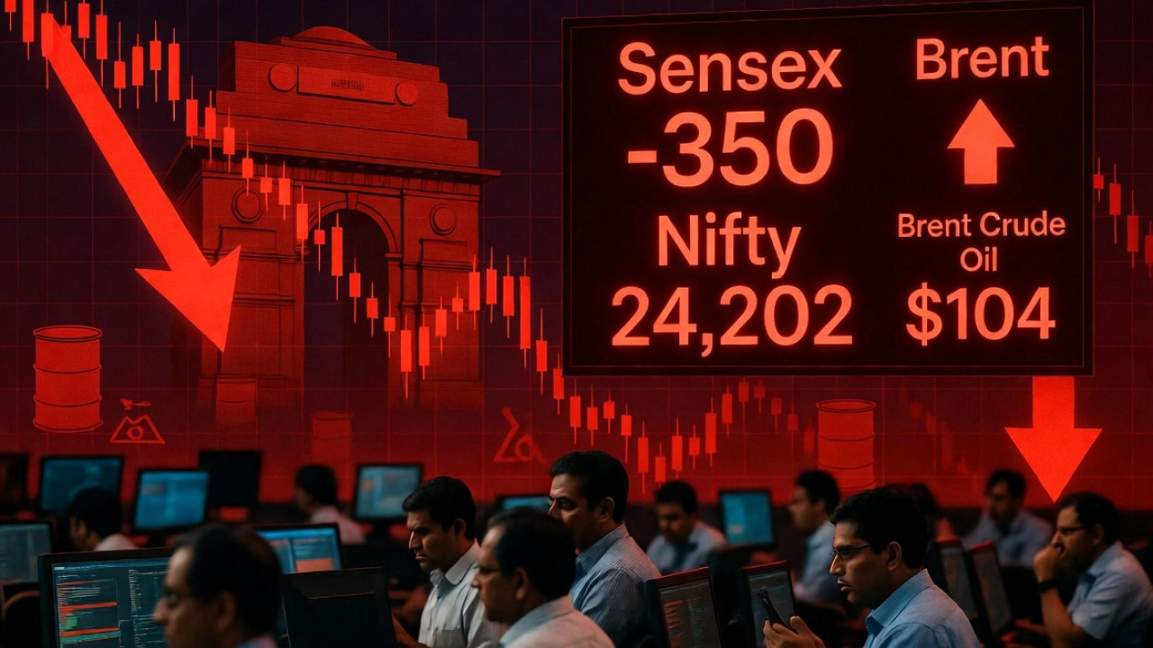 मुंबई: शेयर बाजार में आज जोरदार गिरावट देखने को मिली. सेंसेक्स 350 अंक टूटकर 77,983 के स्तर पर आ गया, जबकि निफ्टी 0.72 प्रतिशत गिरकर 24,202 पर बंद हुआ. मुख्य वजह अमेरिका-ईरान तनाव के बीच कच्चे तेल की कीमतों में तेज उछाल है, जो 104 डॉलर प्रति बैरल के पार पहुंच गया है.