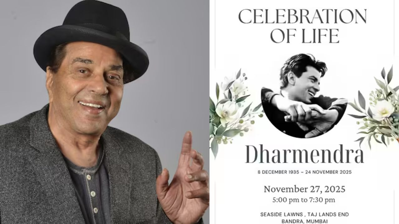 इनवाइट कार्ड में युवा धर्मेंद्र की एक प्यारी सी फोटो लगी है, जो उनके चेहरे पर बिखरी मुस्कान को दिखाती है. कार्ड पर लिखा है- 'धर्मेंद्र: 8 दिसंबर 1935 से 24 नवंबर 2025'. प्रेयर मीट मुंबई के ताज लैंड्स एंड, बांद्रा के सी-साइड लॉन में शाम 5 बजे से 7:30 बजे तक चलेगी. परिवार ने सोशल मीडिया पर ये इनवाइट शेयर किया, जिसमें दोस्तों, रिश्तेदारों और इंडस्ट्री वालों को बुलाया गया है.