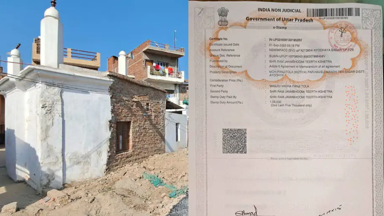 Ayodhya Mosque Deal: अयोध्या में तैयार हो रहे राम मंदिर के उद्घाटन में अब महज कुछ महीनों का वक्त है. इसी बीच श्री राम मंदिर ट्रस्ट पर एक संगीन आरोप लगे हैं. श्री राम मंदिर ट्रस्ट पर गलत तरीके से पांजी टोला में स्थित एक मस्जिद को खरीदने का आरोप लगा है. नया घाट से सहादतगंज तक बन रहा 13 किमी लंबा रामपथ इसी मस्जिद के बगल से निकला है. इस मस्जिद को खरीदने के लिए श्री राम मंदिर ट्रस्ट ने मस्जिद के केयरटेकर रईस अहमद से 30 लाख रुपए में इसका एग्रीमेंट किया गया और 15 लाख रुपए का एडवांस भी दे दिया गया.