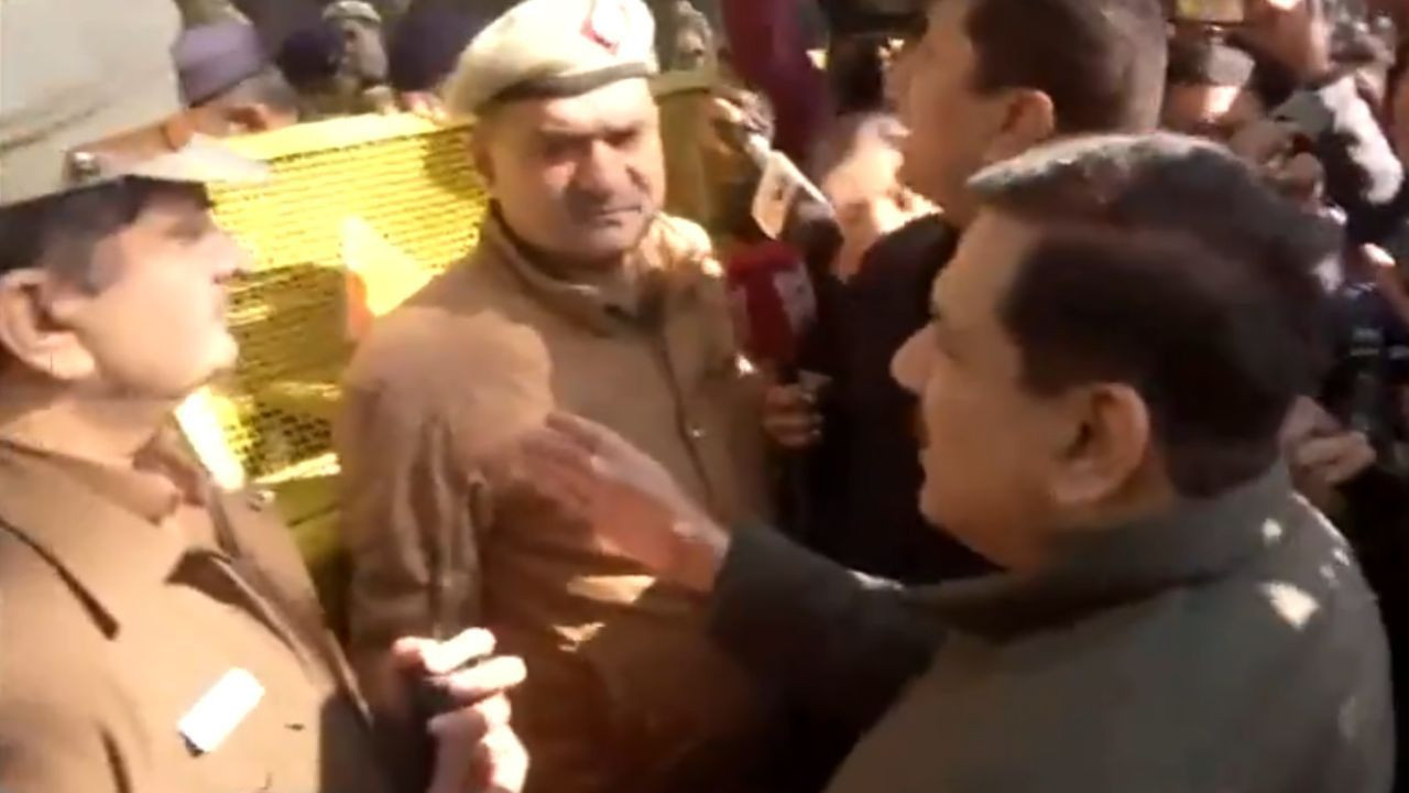 #WATCH | दिल्ली के मंत्री सौरभ भारद्वाज और AAP सांसद संजय सिंह मुख्यमंत्री आवास पर पहुंचे, जहां पुलिस बैरिकेडिंग लगाई गई है और भारी सुरक्षा तैनात की गई है।