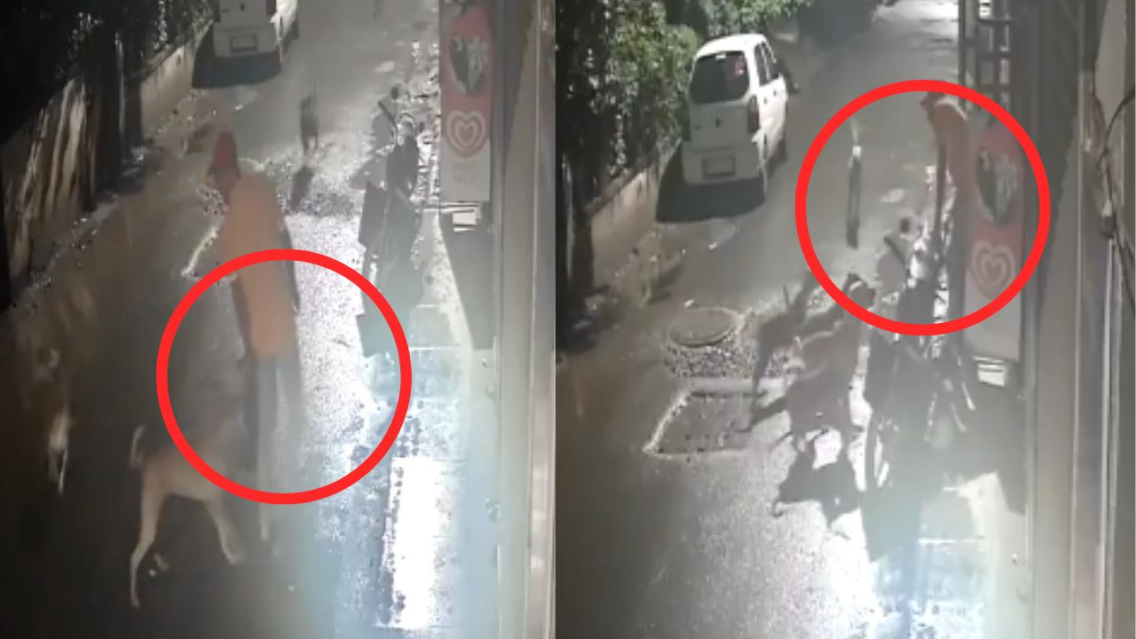 वीडियो में देखा जा सकता है कि शख्स एक सुनसान गली से गुजर रहा था, तभी अचानक सात कुत्ते दौड़ते हुए उसकी ओर आए और उस पर झपट पड़े. कुत्ते उसे काटने की कोशिश करने लगे. खुद को बचाने के लिए वह शख्स पास खड़ी एक बाइक के पीछे जाकर खड़ा हो गया. लेकिन कुत्ते नहीं रुके, तब उसने बहादुरी दिखाते हुए बाइक को धक्का देकर कुत्तों को डराने की कोशिश की.