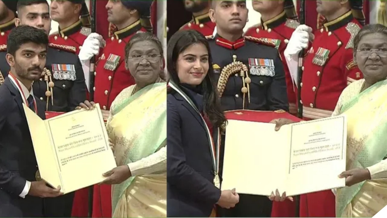 नयी दिल्ली, 17 जनवरी (भाषा ) दो ओलंपिक पदक जीतने वाली निशानेबाज मनु भाकर और शतरंज विश्व चैम्पियन डी गुकेश शुक्रवार को यहां राष्ट्रीय खेल पुरस्कार समारोह में राष्ट्रपति द्रौपदी मुर्मू से जब मेजर ध्यानचंद खेलरत्न सम्मान लेने पहुंचे तो तालियों की गड़गड़ाहट के साथ उनका स्वागत किया गया .