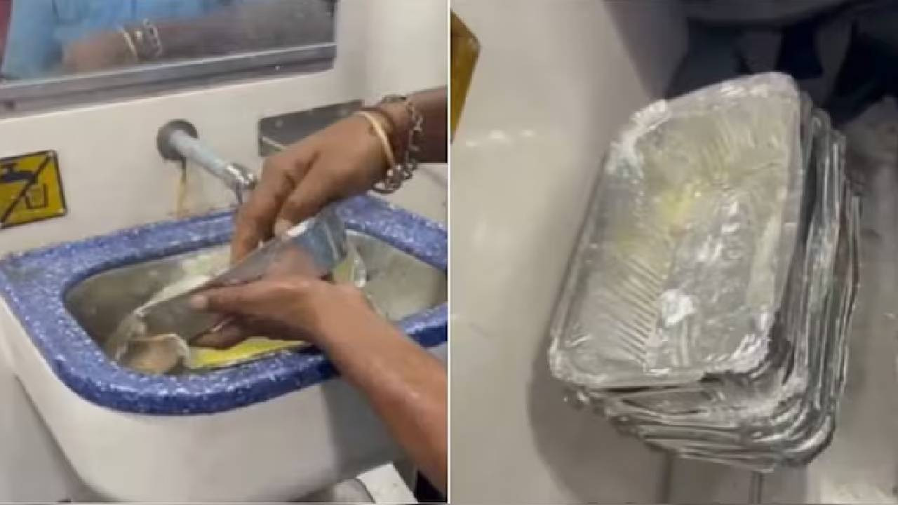 ये वीडियो अमृत भारत एक्सप्रेस (16601) का है- जहां गंदे डिस्पोजेबल फूड कंटेनर्स को धोकर दोबारा खाना देने के लिए रखा जा रहा है।