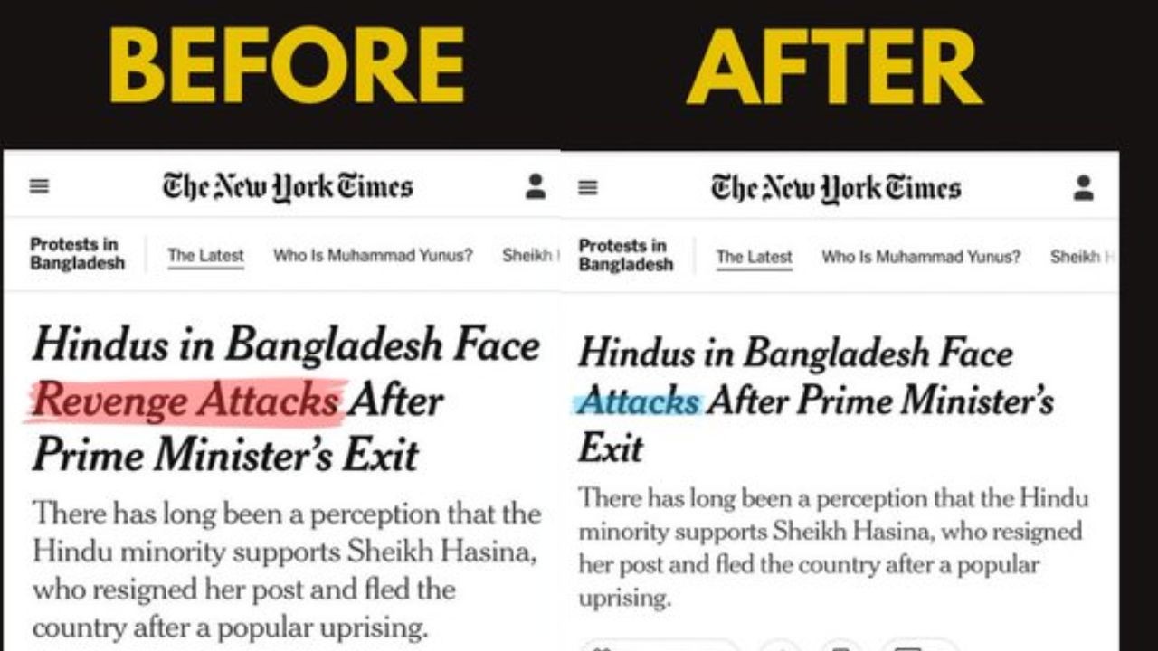 सोशल मीडिया पर जब हिंदुस्तानियों ने न्यू यॉर्क टाइम्स की स्टोरी की हेडलाइन को जोरदार तरीके से शेयर करते हुए विरोध किया. अखबार आर्टिकल की हेडलाइन पहले इस तरह दी थी- 'हिंदूज इन बांग्लादेश फेस रिवेंज अटैक ऑफ्टर प्राइम मिनिस्टर एग्जिट'. इसके बाद जब सोशल मीडिया पर इस खबर की हेडलाइन को भारतीयों ने शेयर करते हुए आलोचना की तो हेडिंग को बदलकर ऐसा कर दिया गया-'हिंदूज इन बांग्लादेश फेस अटैक ऑफ्टर प्राइम मिनिस्टर एग्जिट.'