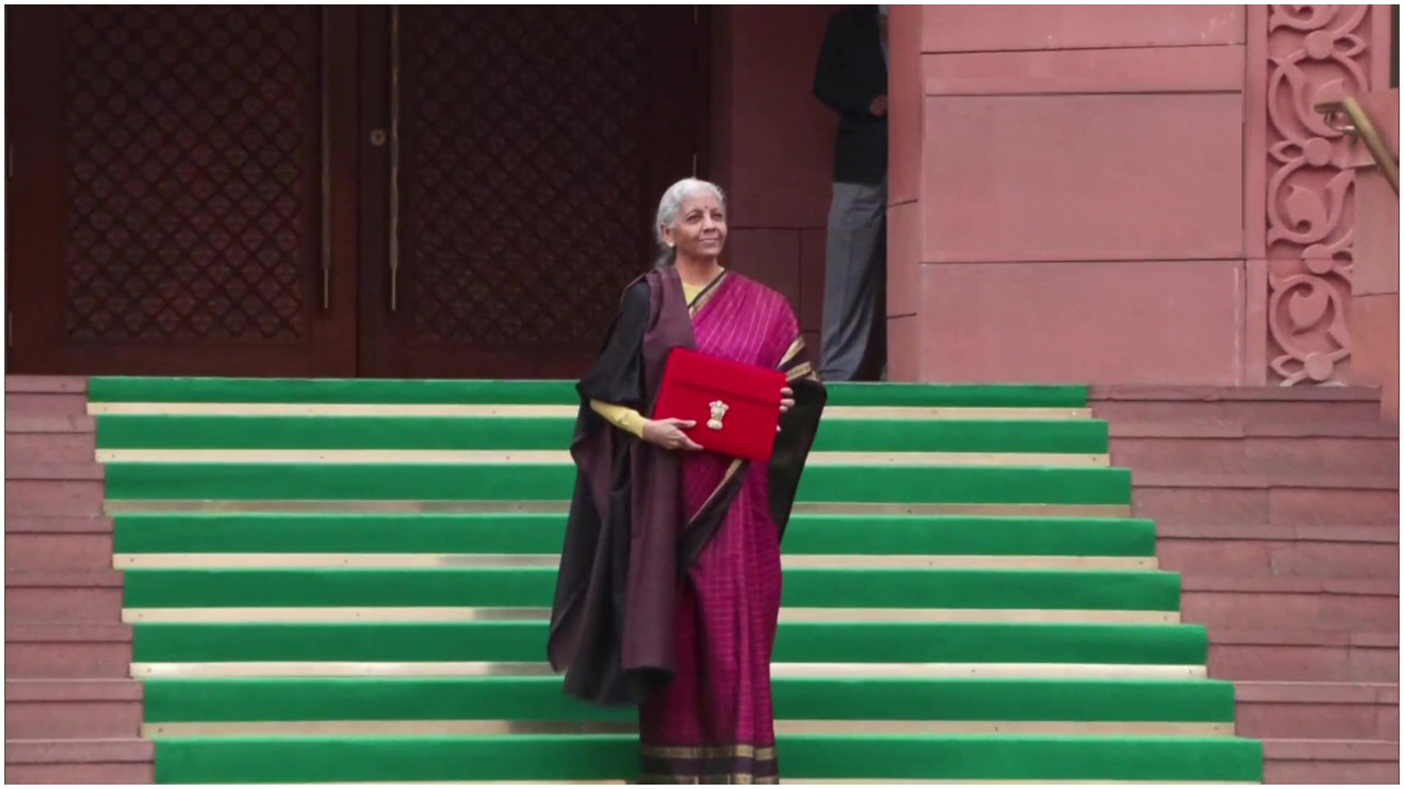साल 2023 के बजट के दिन वित्त मंत्री ने गहरे लाल रंग की रेशमी साड़ी पहनी थी. इस साड़ी का बॉर्डर काले और सुनहरे रंग का था, जो मंदिर की बनावट जैसा दिखता था. बॉर्डर पर रथ मोर और कमल जैसे पारंपरिक डिजाइन बने हुए थे. यह साड़ी दक्षिण भारतीय परंपरा की झलक दिखा रही थी.