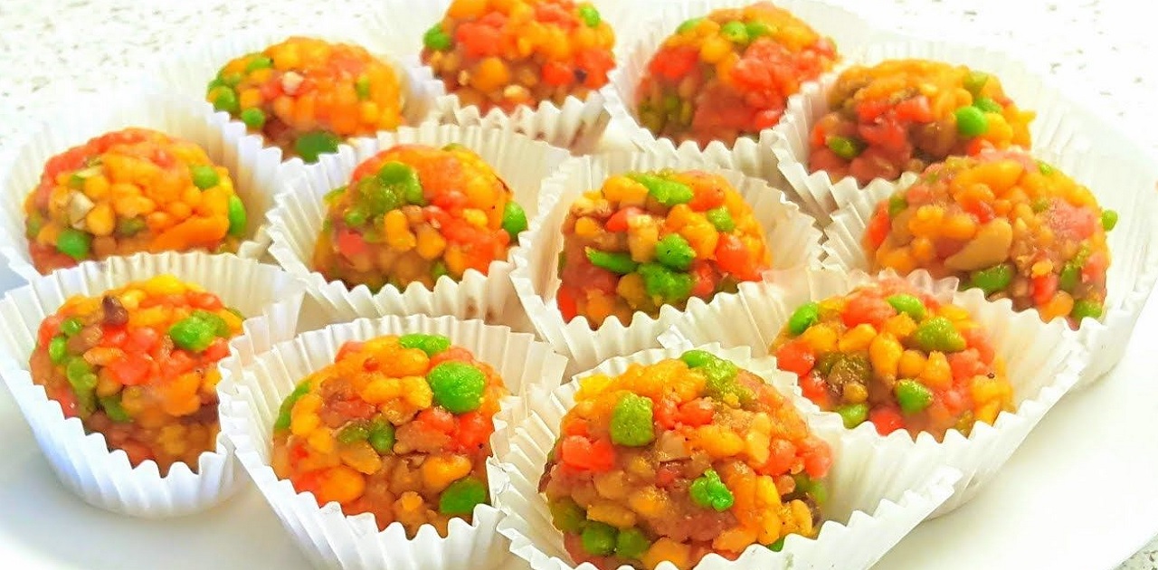 11. ठंडा होने के लिए एक तरफ रख दें और इस बीच एक सपाट प्लेट पर सूखे नारियल को फैलाएं और तीनों मिश्रणों को लड्डू का आकार दें और सफेद नारियल को सूखे नारियल के ऊपर रोल करके अच्छी तरह से ढक दें.