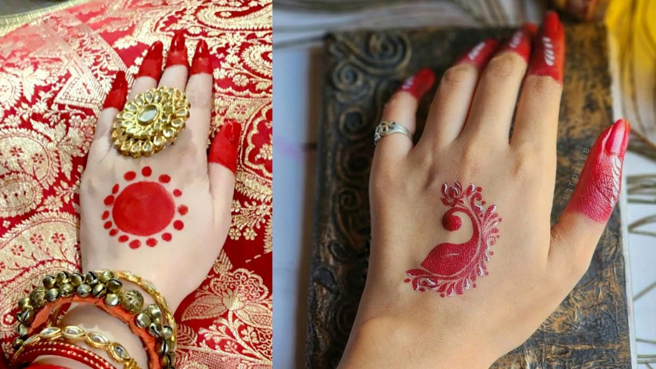करवा चौथ पर केमिकल मेहंदी की बजाय, आलता से अपने हाथों पर यह पारंपरिक मेहंदी लगाएं. इसे क्लासिक बंगाली आलता मेहंदी भी कहा जाता है. इसमें छोटे-छोटे फूल, पत्ते और मोर व पंखों जैसे डिजाइन होते हैं. उंगलियों को गाढ़े लाल आलते से सजाया जाता है, जो हाथों को आकर्षक बनाता है.