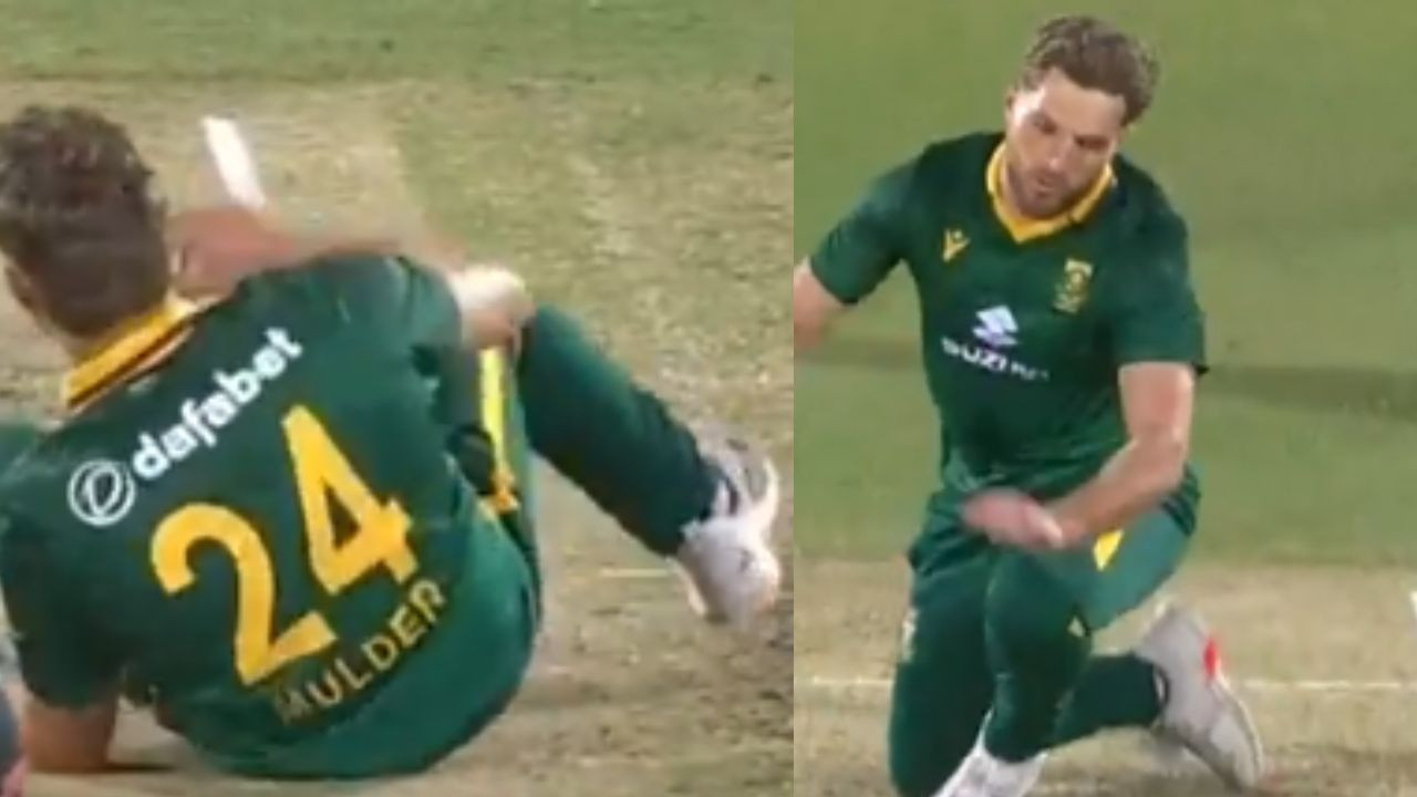 मैच के 10वें ओवर की पहली गेंद फेंकने से पहले वियान मुल्डर अपने रन-अप के दौरान अचानक फिसल गए और जमीन पर गिर पड़े. यह हादसा देखकर हर कोई हैरान रह गया, क्योंकि मुल्डर का घुटना गंभीर रूप से चोटिल हो सकता था. हालांकि, मुल्डर खुशकिस्मत रहे और उन्हें कोई गंभीर चोट नहीं आई. वह तुरंत उठे और अगली ही गेंद पर उन्होंने ऑस्ट्रेलिया के कप्तान मिशेल मार्श को 18 रन (25 गेंद, चार चौके) पर आउट कर पवेलियन भेज दिया. इस घटना का वीडियो सोशल मीडिया पर तेजी से वायरल हो रहा है.