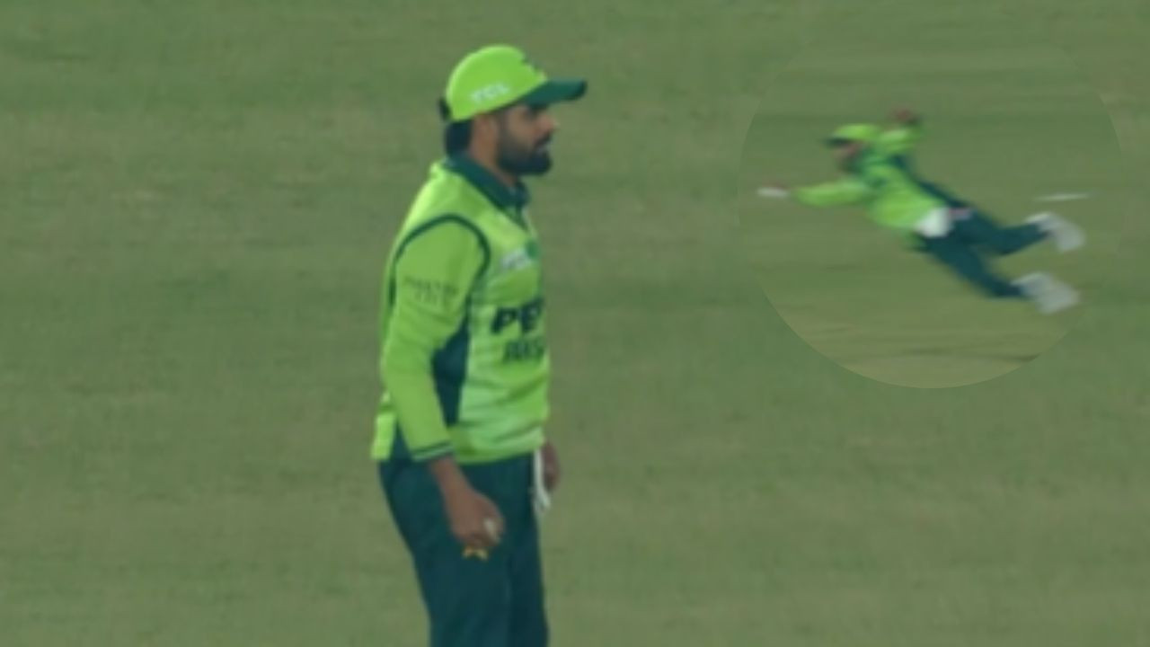 वहां खड़े बाबर आजम ने अपना दाहिना हाथ फैलाया और गेंद उनके पास से गुजरने वाली थी लेकिन उन्होंने हवा में उछलकर एक हाथ से उसे लपक लिया. यह कैच इतना सटीक था कि स्टेडियम में मौजूद दर्शक तालियां बजाने लगे. बाबर ने खुशी से मुट्ठी दिखाई और टीम के साथी दौड़कर उन्हें बधाई देने आए.