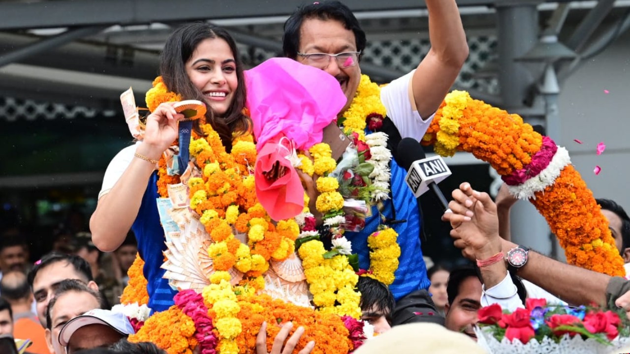 #WATCH | Double Olympic medalist Manu Bhaker receives a grand welcome after she arrives at Delhi airport after her historic performance in #ParisOlympics2024