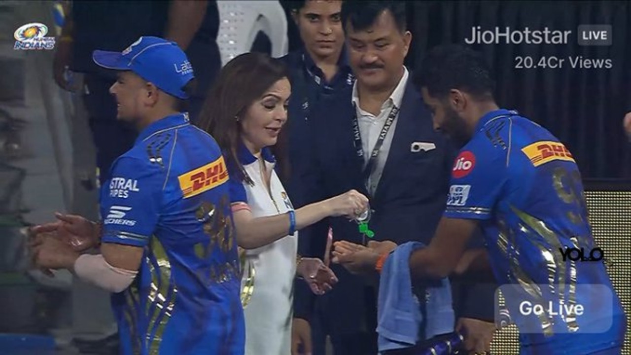 नीता अंबानी को बुमराह की हथेली पर हैंड सैनिटाइजर डालते हुए देखा गया, इससे पहले कि वह एमआई के लेग स्पिनर कर्ण शर्मा के साथ भी ऐसा ही करतीं देखी गई. बुमराह ने खुशी-खुशी अंबानी के अनुरोध को स्वीकार किया और अपने हाथों को सैनिटाइज करने के बाद ही जश्न मनाया.