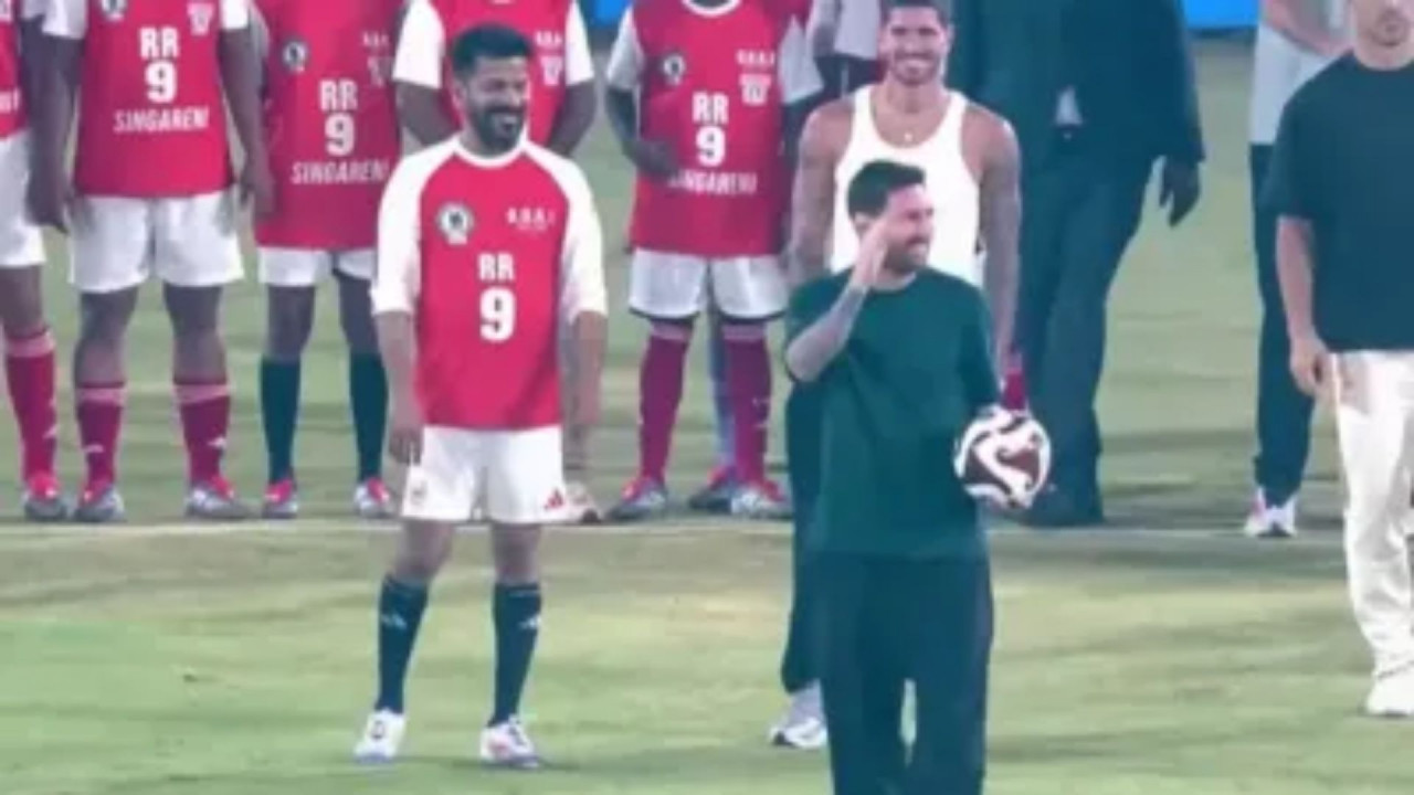उप्पल स्टेडियम में रेवंत रेड्डी-9 टीम और मेसी ऑल स्टार्स के बीच एक फ्रेंडली मैच खेला जा रहा है. मैच से पहले स्टेडियम में म्यूजिकल नाइट का आयोजन किया गया, जिसके बाद एक भव्य लेजर शो भी देखने को मिला. इस लेजर शो में लियोनल मेसी और कांग्रेस नेता राहुल गांधी की तस्वीर बनाई गई, जिसने दर्शकों का ध्यान आकर्षित किया. इस कार्यक्रम में राहुल गांधी भी मौजूद रहे. इससे पहले राहुल गांधी और मुख्यमंत्री रेवंत रेड्डी ने ताज फलकनुमा पैलेस में मेसी से मुलाकात की थी.