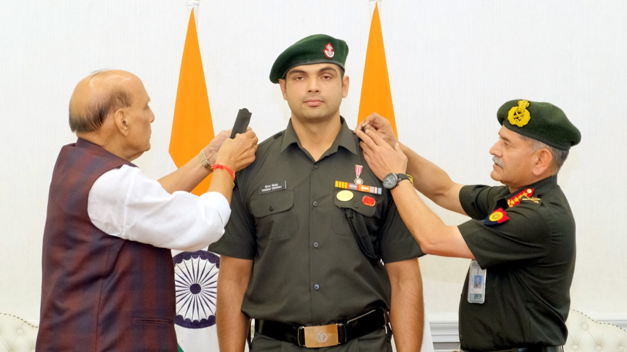 Neeraj Chopra: भारत के स्टार एथलीट नीरज चोपड़ा को दिल्ली में एक खास पिपिंह समारोह में लेफ्टिनेंट कर्नल का रैंक दिया गया. रक्षा मंत्री राजनाथ सिंह और थल सेना प्रमुख जनरल उपेंद्र द्विवेदी ने खुद नीरज को इस सम्मान से नवाजा और उन्हें शुभकामनाएं दीं. यह सम्मान नीरज की खेल उपलब्धियों की मान्यता है, जो 16 अप्रैल 2025 को राष्ट्रपति द्वारा टेरिटोरियल आर्मी में दिए गए मानद कमीशन का औपचारिक रूप था.