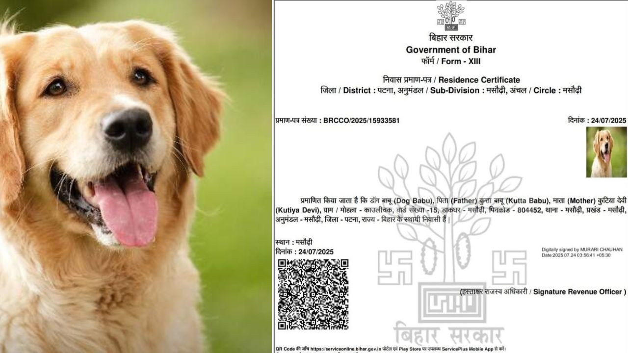 Patna Dog Certificate: बिहार की राजधानी पटना में प्रशासनिक लापरवाही का एक चौंकाने वाला मामला सामने आया है. मसौढ़ी प्रखंड के आरटीपीएस काउंटर से एक कुत्ते के नाम पर आवासीय प्रमाण पत्र जारी कर दिया गया. इस प्रमाण पत्र में आवेदक का नाम “डॉग बाबू”, पिता का नाम “कुत्ता बाबू” और माता का नाम “कुटिया देवी” दर्ज है. इस प्रमाण पत्र पर राजस्व पदाधिकारी मुरारी चौहान का डिजिटल हस्ताक्षर भी मौजूद था. जो 24 जुलाई को जारी किया गया है.