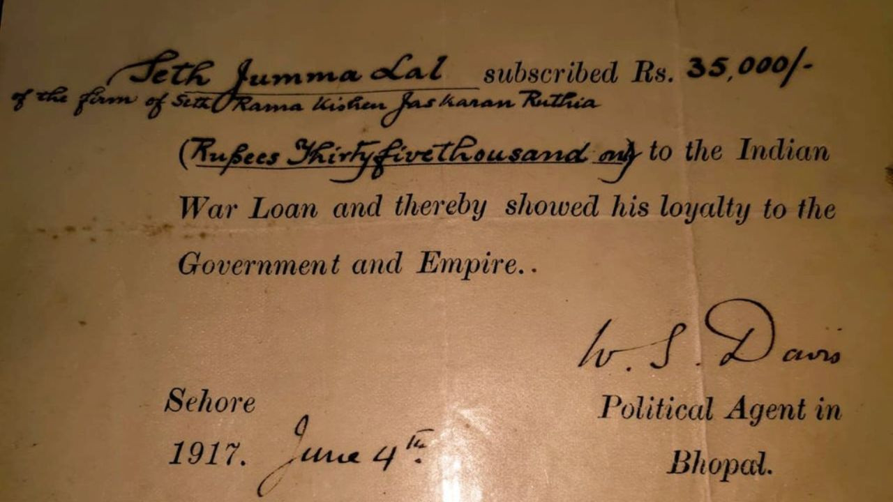 1917 में जब पूरी दुनिया प्रथम विश्व युद्ध की आग में झुलस रही थी, उसी दौरान ब्रिटिश सरकार ने भोपाल रियासत के प्रमुख व्यापारी सेठ जुम्मा लाल रूठिया से 35,000 रुपये का लोन लिया था. उस समय यह राशि बहुत बड़ी थी, जो युद्ध प्रयासों और भोपाल क्षेत्र में प्रशासनिक प्रबंधन के लिए इस्तेमाल की गई. परिवार के पास सुरक्षित एक प्रमाण-पत्र, दिनांक 4 जून 1917, में लिखा है कि सेठ जुम्मा लाल रूठिया ने 'इंडियन वॉर लोन' में 35,000 रुपये का योगदान दिया, जिससे उन्होंने सरकार और साम्राज्य के प्रति निष्ठा दिखाई.