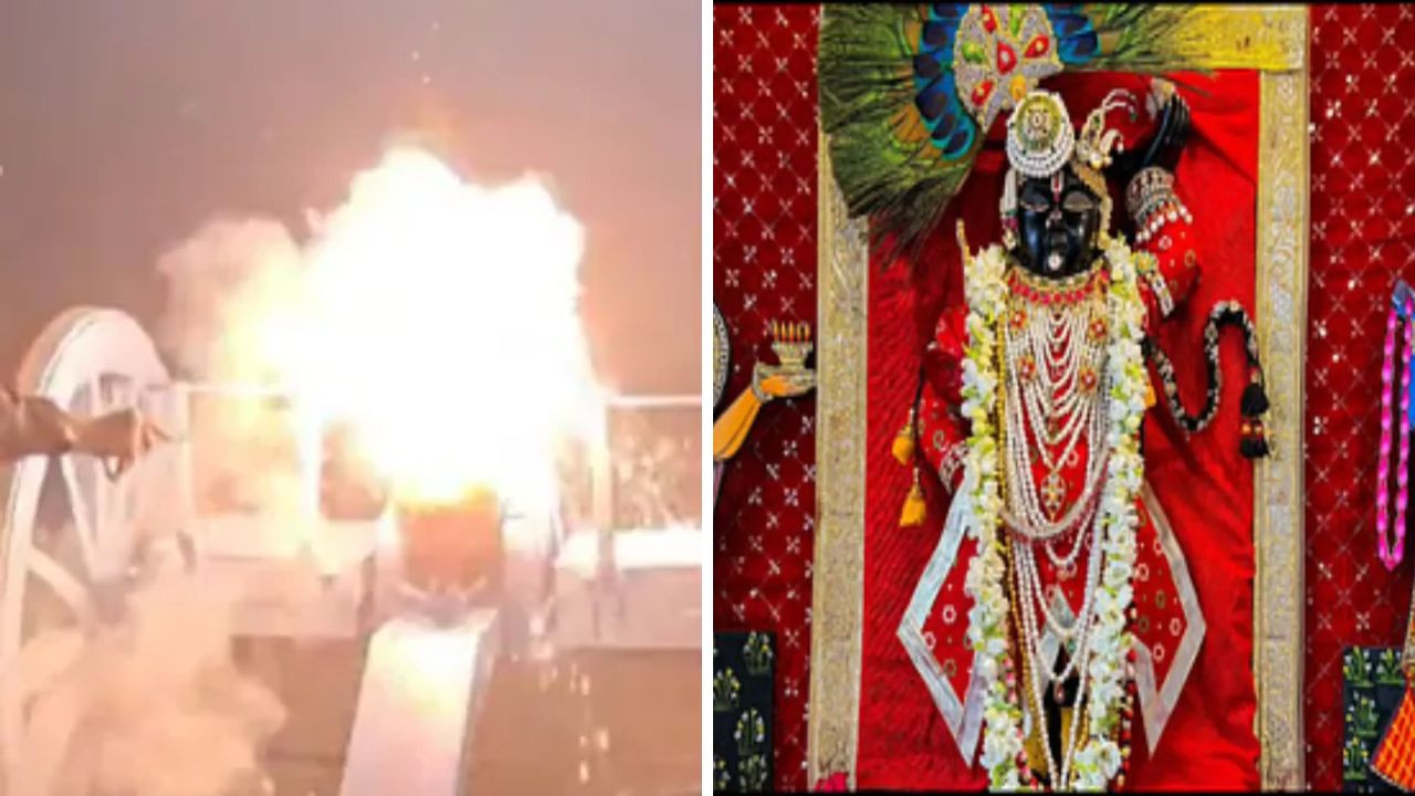 Nathdwara Shrinathji Temple: राजस्थान के नाथद्वारा में श्रीनाथजी मंदिर जन्माष्टमी के अवसर पर अपनी ऐतिहासिक और अनूठी परंपरा के लिए जाना जाता है. इस बार भी जैसे ही घड़ी ने रात के 12 बजाए, वैसे ही मंदिर परिसर में 352 साल पुरानी परंपरा निभाई गई. ठाकुरजी के जन्म के प्रतीक स्वरूप मध्यरात्रि में 21 तोपों की सलामी दी गई. इस दृश्य को देखने के लिए बड़ी संख्या में श्रद्धालु मंदिर पहुंचे और इस अद्भुत आयोजन के साक्षी बने.