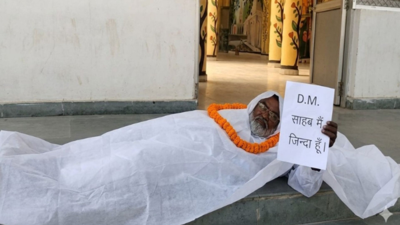 पिछले सात सालों से इशहाक अली अपने आप को जिंदा साबित करने के लिए सरकारी दफ्तरों के चक्कर लगा रहे हैं. तहसील से लेकर कलेक्ट्रेट तक, हर जगह उन्होंने गुहार लगाई लेकिन कहीं सुनवाई नहीं हुई. हर बार उन्हें टालमटोल का जवाब मिला. जब वह थक-हारकर निराश हो गए, तो उन्होंने विरोध का अनोखा तरीका सोचा. उन्होंने कफन ओढ़ा और डीएम ऑफिस के बाहर लाश बनकर लेट गए. हाथ में तख्ती लिखी- 'डीएम साहब, मैं जिंदा हूं.' यह तस्वीर देखते ही बनती है कि एक बुजुर्ग को अपनी जिंदगी साबित करने के लिए मौत का नाटक करना पड़ रहा है.