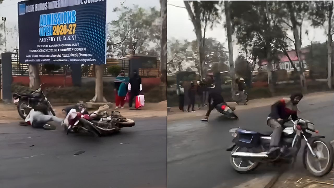 वीडियो में देखा जा सकता है कि एक बाइक सवार गिरता है और उसे देखकर पीछे वाला ब्रेक मारता है, तो वह भी फिसल जाता है. कुछ ही देर में दर्जनों लोग सड़क पर गिर चुके थे और चीख पुकार मच गई. कई बाइक सवारों को चोटें आईं और लोग दर्द से कराहते नजर आए. इस घटना में किसी की जान नहीं गई.