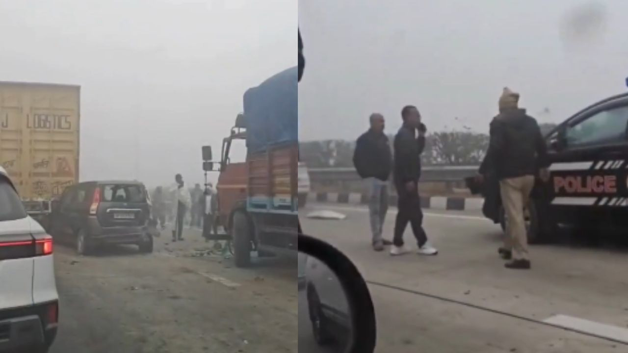 VIDEO | Greater Noida: Multiple vehicles collided on the Eastern Peripheral Expressway amid dense fog, leaving several people injured.