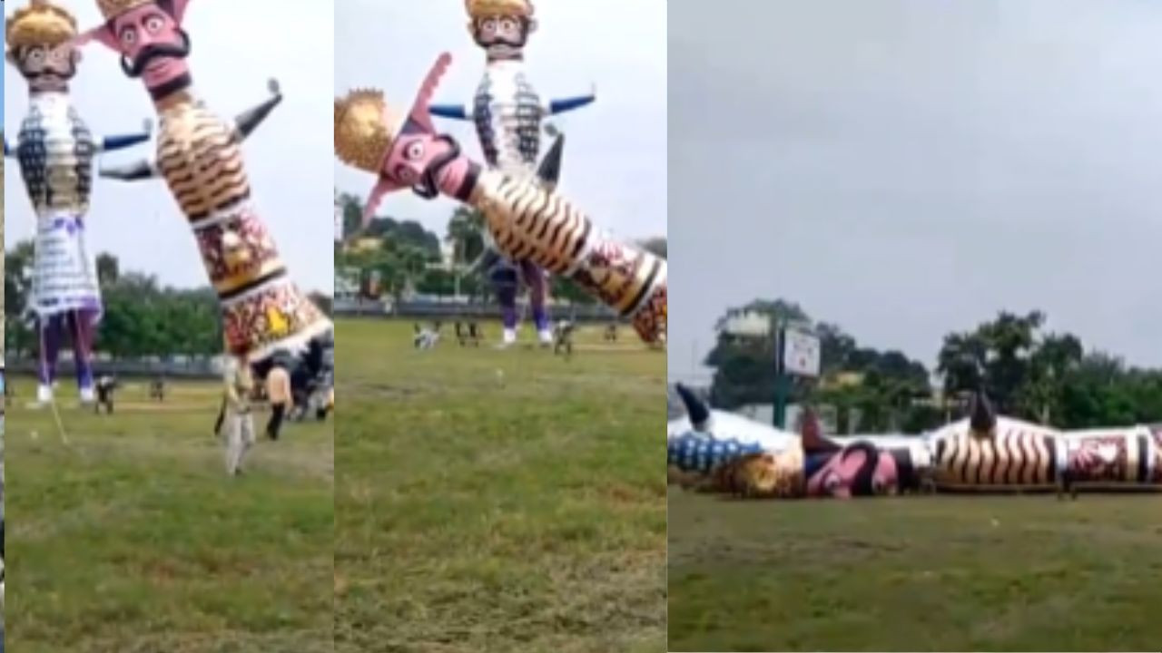 रुद्रपुर के गांधी पार्क में दशहरा उत्सव के लिए रावण (65 फीट), कुंभकरण और मेघनाद (60-60 फीट) के विशाल पुतले बनाए गए थे. आयोजक और दर्शक शाम को दहन का बेसब्री से इंतजार कर रहे थे. लेकिन दोपहर में अचानक मौसम ने करवट ली और तेज हवा के साथ बारिश ने स्थिति बिगाड़ दी. हवा के जोर से तीनों पुतले संतुलन खो बैठे और जोरदार आवाज के साथ जमीन पर गिर पड़े. इस नजारे को देखते ही लोग हैरान रह गए और कुछ पल के लिए माहौल में अफरा-तफरी फैल गई.