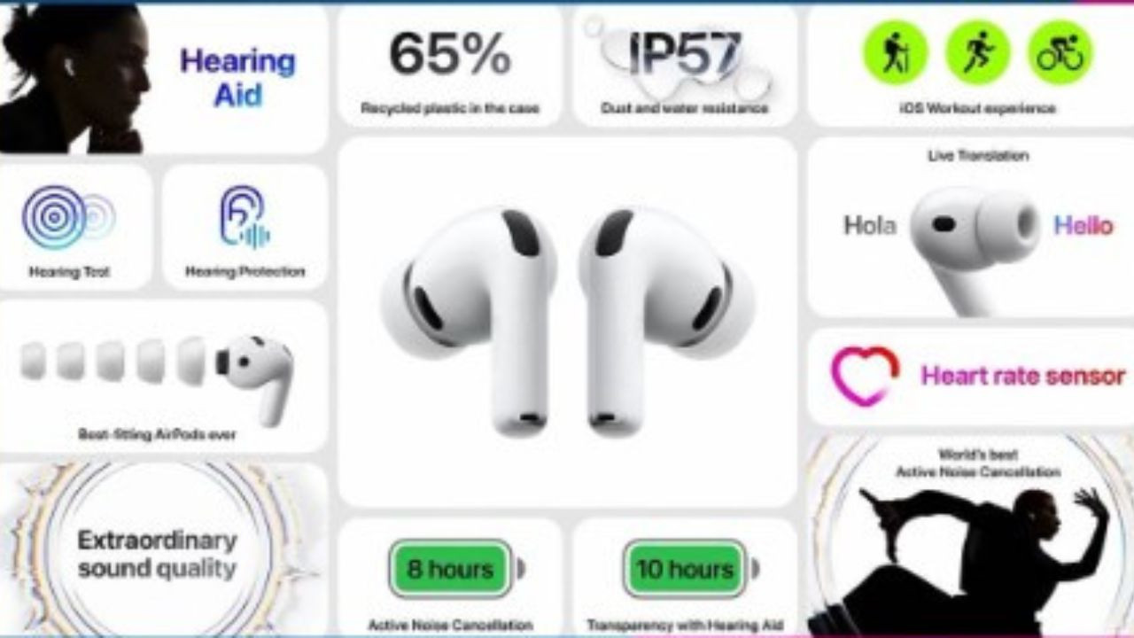 Apple Event: एप्पल ने अपने ताज़ा लॉन्च इवेंट में सबसे पहले AirPods Pro 3 को पेश किया. कंपनी ने दावा किया है कि यह सिंगल चार्ज में 8 घंटे तक की बैटरी लाइफ ऑफर करेगा, जो लंबे समय तक म्यूजिक सुनने और कॉल्स के लिए बेहतरीन विकल्प साबित होगा.