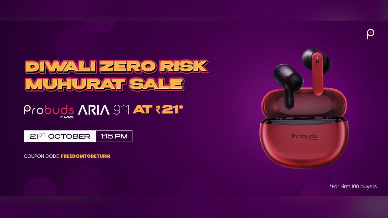 कितने में मिलेंगे लावा प्रोबड्स: प्रोबड्स ने दिवाली जीरो-रिस्क मुहूर्त सेल नाम का एक स्पेशल दिवाली अभियान शुरू किया है, जिसका उद्देश्य फेस्टिव सीजन में लोगों की बचत कराना है. यह सेल 21 अक्टूबर को दोपहर 1:15 बजे से शुरू होगी, जो मुहूर्त ट्रेडिंग डे के साथ मेल खाता है. प्रोबड्स आरिया 911 को 999 रुपये के बजाय 21 रुपये में खरीदा जा सकता है.