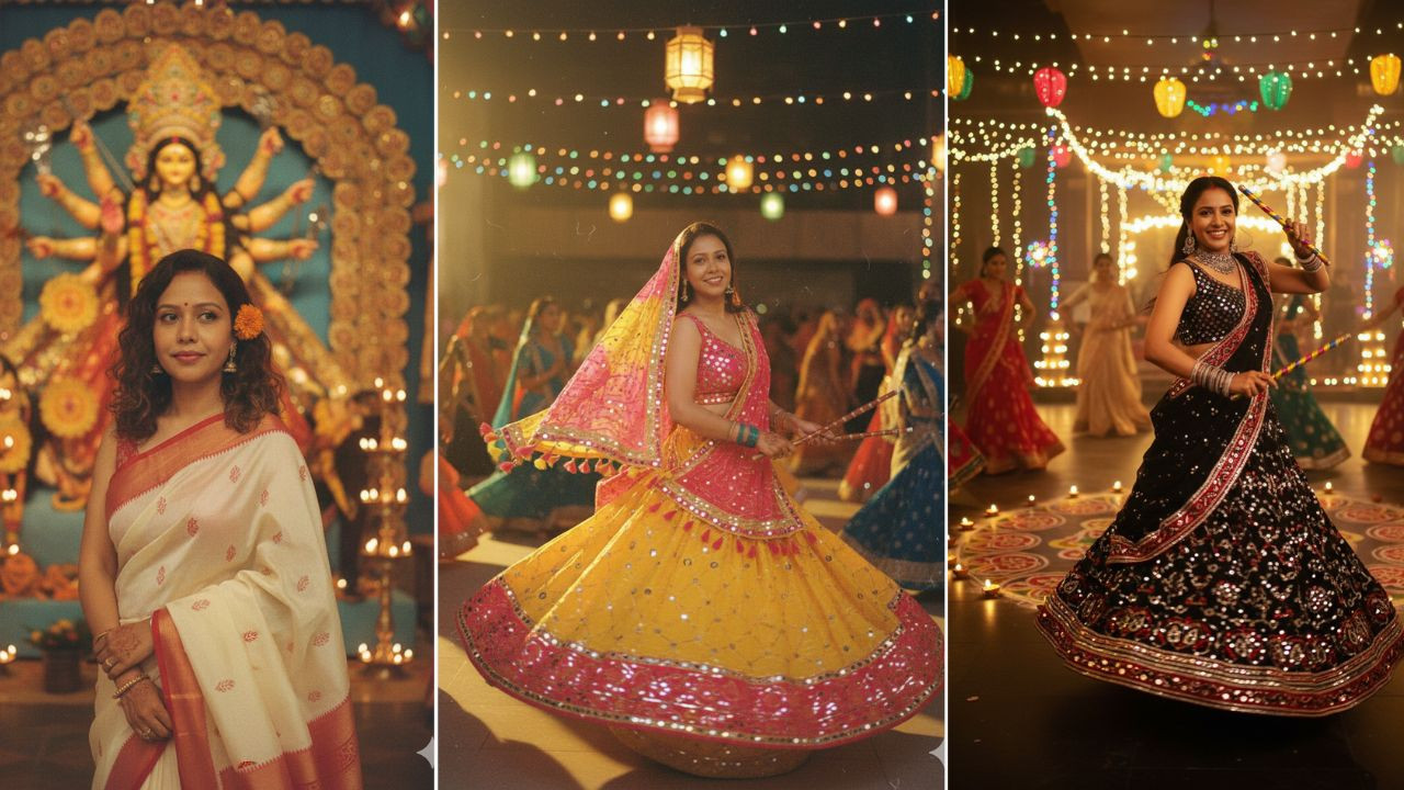 प्रॉम्प्ट 3: "Convert my photo into a cinematic Dandiya night shot. I'm mid-dance, holding colorful dandiya sticks, dressed in a black, red, and white lehenga with heavy mirror work and oxidized jewelry. The background is a lively Garba circle with bright festive lights, glowing diyas, and rangoli patterns. Add warm golden lighting and a touch of motion blur to capture the energy."