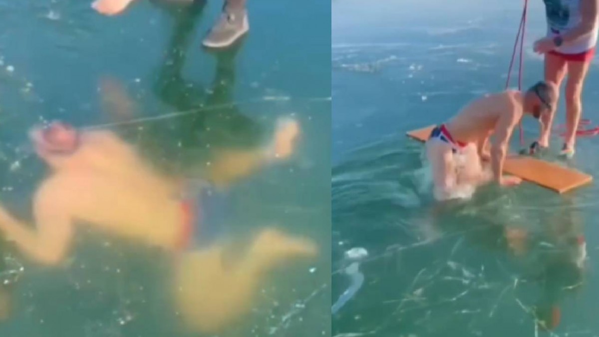 इस वायरल वीडियो में देखा जा सकता है कि बर्फ से ढकी एक झील पर कुछ लोग खड़े नजर आ रहे हैं इसी बीच एक शख्स उसी झील में कूद जाता है. जो एक जगह से अंदर जाने का रास्ता होता है जिससे वो अंदर पानी में चला जाता है. वहीं कुछ देर ठंडे पानी में रहने के बाद वो एक तो पानी में कांपता नजर आता है इसके साथ ही बाहर निकलने का रास्ता भी भूज जाता है. हालांकि वो बाद में एक रस्सी के सहारे निकलता है. पानी से निकलने के बाद उसकी स्थिति ऐसी होती है जैसी मानों वो मौत को छू करके वापस आ रहा हो.