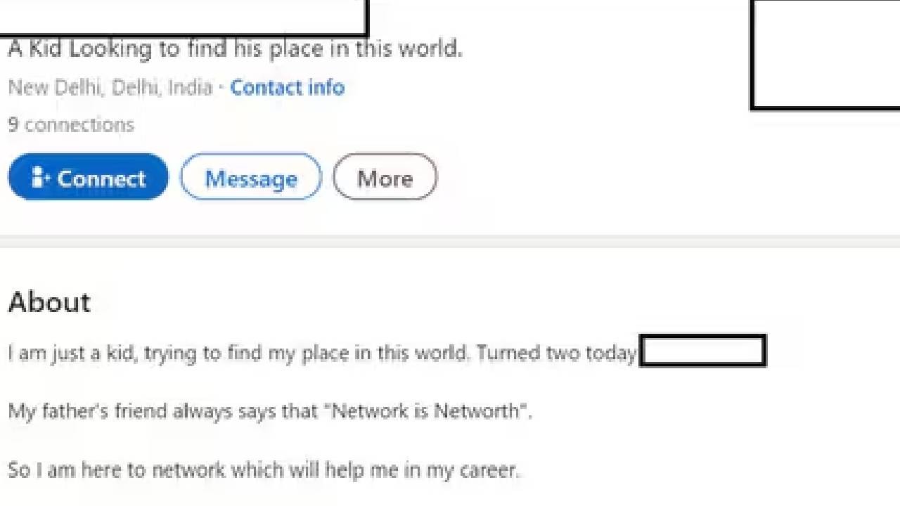 दो साल के बच्चे ने अपनी लिंक्डन डेब्यू पोस्ट में लिखा किआज मैं दो साल का हो गया और मुझे इस दुनिया का दबाव महसूस होने लगा है. घर पर मुझे स्कूल में दाखिला दिलाने के लिए बहुत सारी बातें हो रही हैं. हम्म, दबाव असली है और मैं नन्ही सी जान हूँ. मेरे पिता सिवेश कुमार के दोस्त प्रवीण कुमार राजभर हमेशा कहते हैं कि नेटवर्क ही नेटवर्थ है. इसलिए मैं यहाँ नेटवर्क बनाने आया हूँ जो मुझे एक अच्छे प्री-स्कूल में दाखिला दिलाने में मदद करेगा. इसी पोस्ट में आगे लिखा है कि एक बार और में एक कदम आगे बढ़ाऊँगा. मैं सोशल मीडिया से दूर रहने की कोशिश कर रहा हूँ (क्योंकि घर पर कोई मुझे फोन नहीं देता) लेकिन फिर भी अपने करियर के लिए हफ्ते में एक बार लॉग इन करने की कोशिश करूँगा. आप सब से मदद की उम्मीद है.