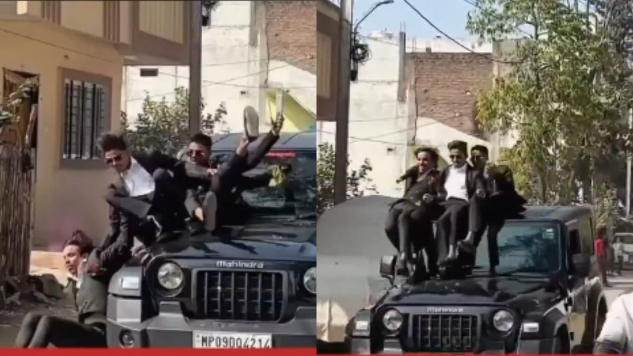 बताया जा रहा है कि ये छात्र 12वीं की थे और फेयरवल पार्टी में शामिल होने के लिए थार की छतपर बैठकर जा रहे थे. वीडियो में साफतौर पर देखा जा सकता है कि तीनों छात्र कैसे बोनट पर पैर रकखर बैठे हैं. तीनों ही ब्लैक सूट में नजर आ रहे हैं. इनके पीछे और भी कई गाड़ियां आ रही हैं. पूरी रैली निकालकर इलाके में रौब दिखा रहे थे.