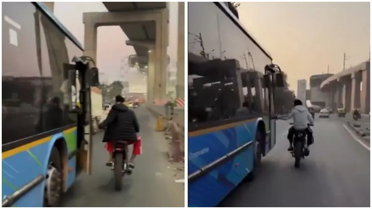 दिल्ली के नॉर्थ ईस्ट इलाके में एक खतरनाक स्टंट का वीडियो सोशल मीडिया पर तेजी से वायरल हुआ. वीडियो में एक युवक बिना नंबर प्लेट वाली मोटरसाइकिल चलाते हुए ट्रैफिक के बीच नजर आया. क्लिप में वह चलते वाहनों और एक डीटीसी बस के दरवाजे अचानक खोलता दिखाई देता है. इस हरकत से यात्रियों और सड़क पर मौजूद अन्य लोगों की जान खतरे में पड़ गई.