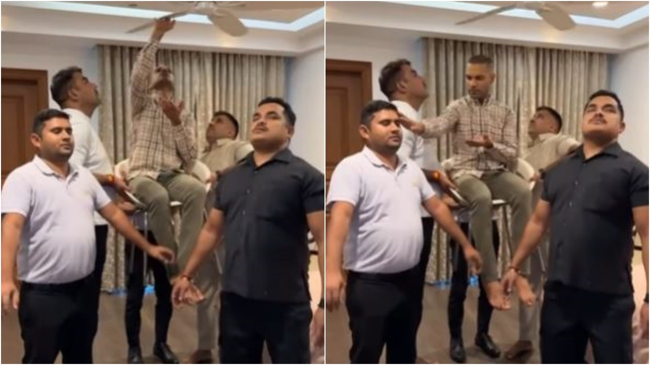 वीडियो में वह पंखा बाबा की तरह एक कुर्सी पर बैठे हुए हैं. दो लोग उन्हें कुर्सी समेत ऊपर उठाते हैं और फिर धवन नंगे हाथों से तेज रफ्तार पंखे को रोक देते हैं और फिर वे आस-पास खड़े लोगों को आशीर्वाद देते हैं. यही नहीं शिखर धवन बुरी तरह हिल रहे एक शख्स पंखा बाबा की तरह ही अपने जादूई हाथ का स्पर्श करते हैं जिसके बाद वह शख्स तुरंत ठीक हो जाता है.
