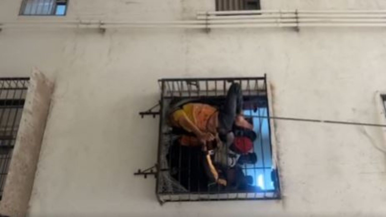 वीडियो में वह आठवीं मंजिल के बाहर खिड़की पर लगे लोगे के ग्रिल में फंसे हुए हैं. उनके पैरों में रस्सी बंधी हुई है और कुछ लोग उन्हें बचाने की भरपूर कोशिश कर रहे हैं.