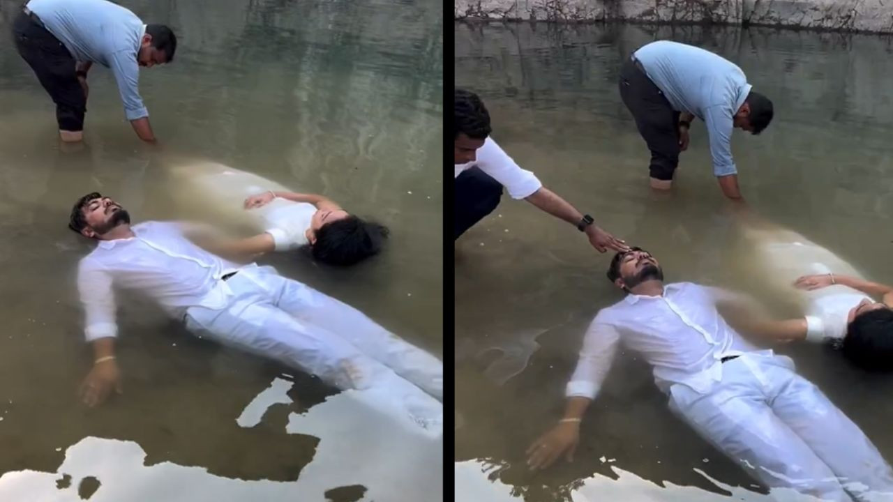 सोशल मीडिया पर एक प्री-वेडिंग फोटोशूट वायरल हो रहा है, जिसमें दूल्हा-दुल्हन किसी महल, वादियों या नदी के किनारे नहीं बल्कि नदी के अंदर लेटे हुए हैं. सुनकर अजीब लग रहा होगा, लेकिन यह सही है. सबसे पहले आप ये वीडियो देखें-