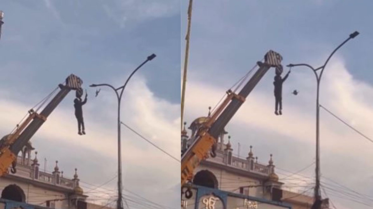 📍 Punjab | Heartwarming viral video: Brave man dangles from a moving crane to free a tiny bird trapped in overhead wires. Pure compassion in action!