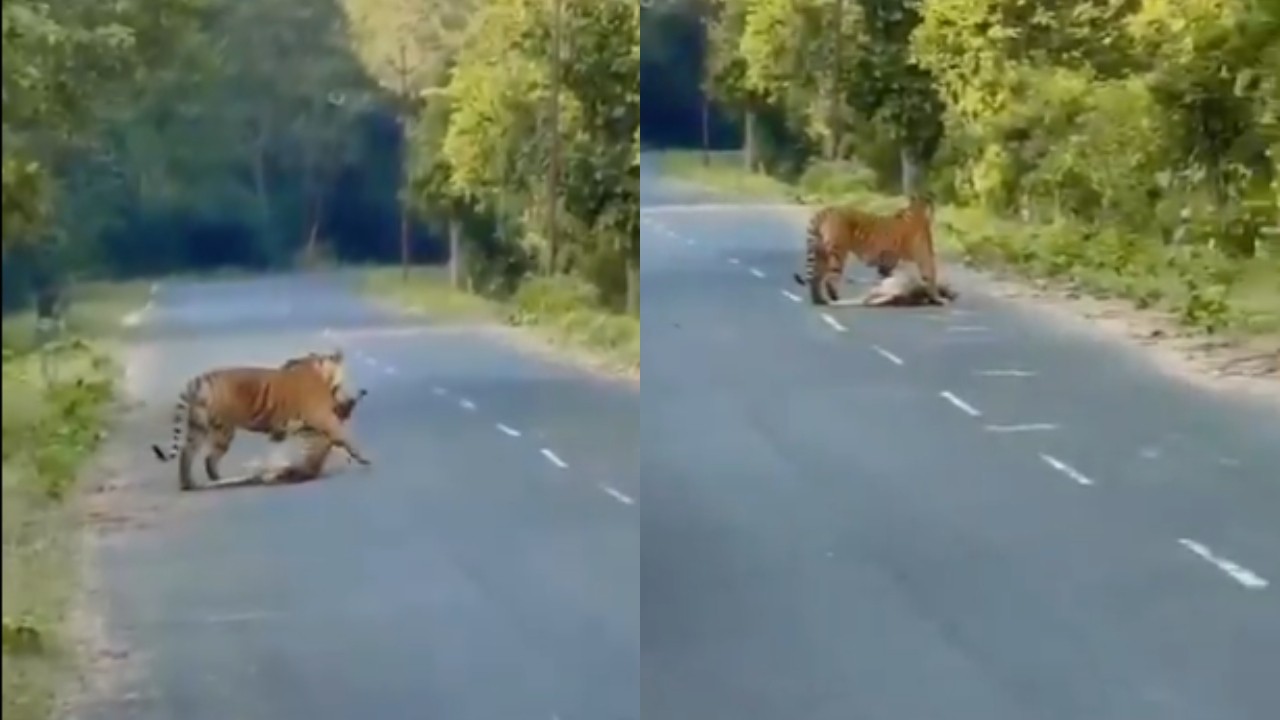 जंगल में बाघ को शिकार करता देखना एक एक अलग रोमांच देता है. जिम कॉर्बेट नेशनल पार्क में प्रकृति का अद्भुत नजारा देखने को मिला है. यहां एक बाघ के मुंह में जिंदा हिरण दिखा. बाघ ने उसे जबड़े में दबाकर रखा था. वह बड़े आराम से उसे अपने जबड़े में दबोचकर सड़क पार करता है. इसका वीडियो सोशल मीडिया पर वायरल हो रहा है.