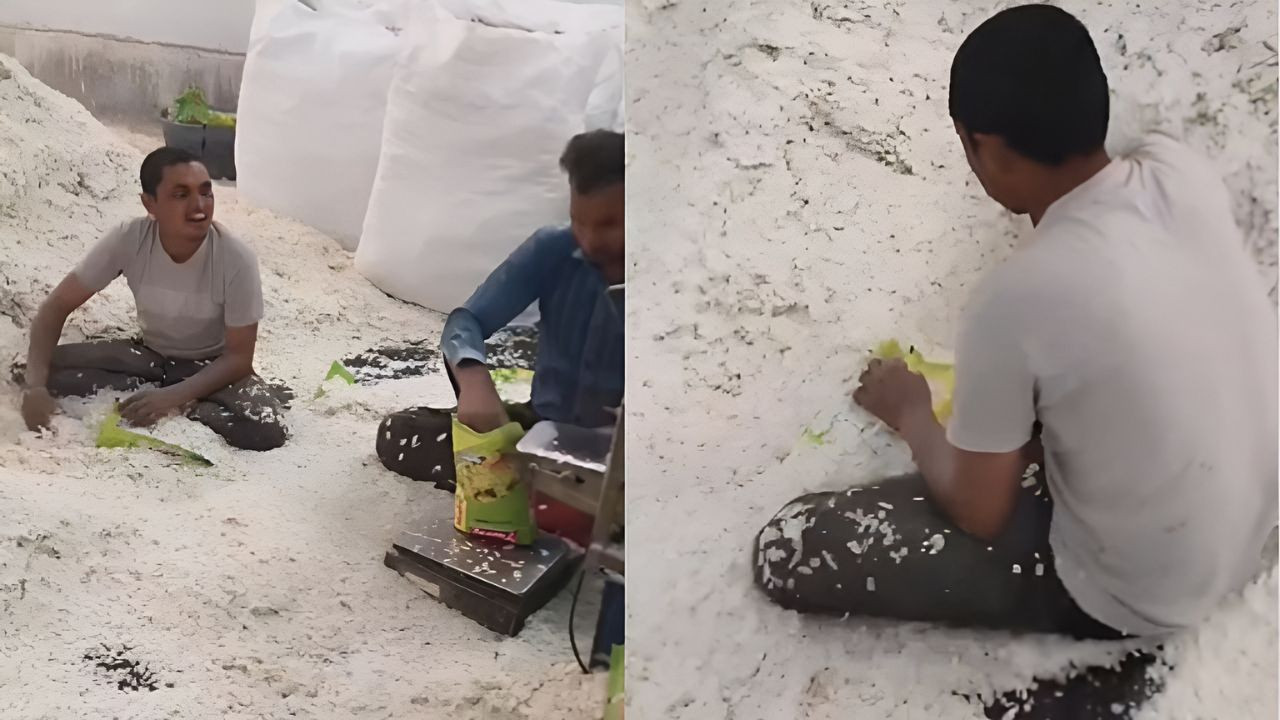 वीडियो में हरी टी-शर्ट पहना एक आदमी जमीन पर फैले पोहे को अपने हाथों से भरता हुआ दिख रहा है. उसके बगल में नीली शर्ट पहना एक आदमी कोने में सीलिंग मशीन पकड़े बैठा है. हरी टी-शर्ट वाला आदमी अपने हाथों से पोहा भरता है और मशीन पर रखता है. फिर दूसरा आदमी उसका वजन करता है और सीलिंग मशीन पर रखता है. फिर पैकेजिंग पूरी होती है. ध्यान देने वाली बात यह है कि पोहा, जिसे लोग इतने चाव से खाते हैं, उसे किसी ट्रे या साफ जगह पर नहीं रखा जाता, बल्कि सीधे फर्श पर फैलाया जाता है.