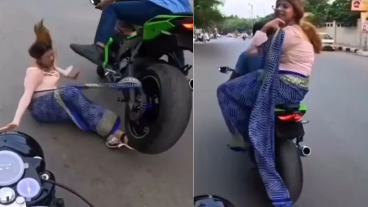 लड़की की साड़ी का पल्लू सड़क पर लटक रहा था. पीछे से आ रहे बाइकसवार युवक ने इशारे से लड़की को आगाह किया, लेकिन लड़की ने उसकी चेतावनी को नजरअंदाज कर दिया और अजीबोगरीब मुंह बनाकर प्रतिक्रिया दी. कुछ ही सेकंड बाद साड़ी का पल्लू बाइक में फंस गया और लड़की धड़ाम से नीचे गिर गई.