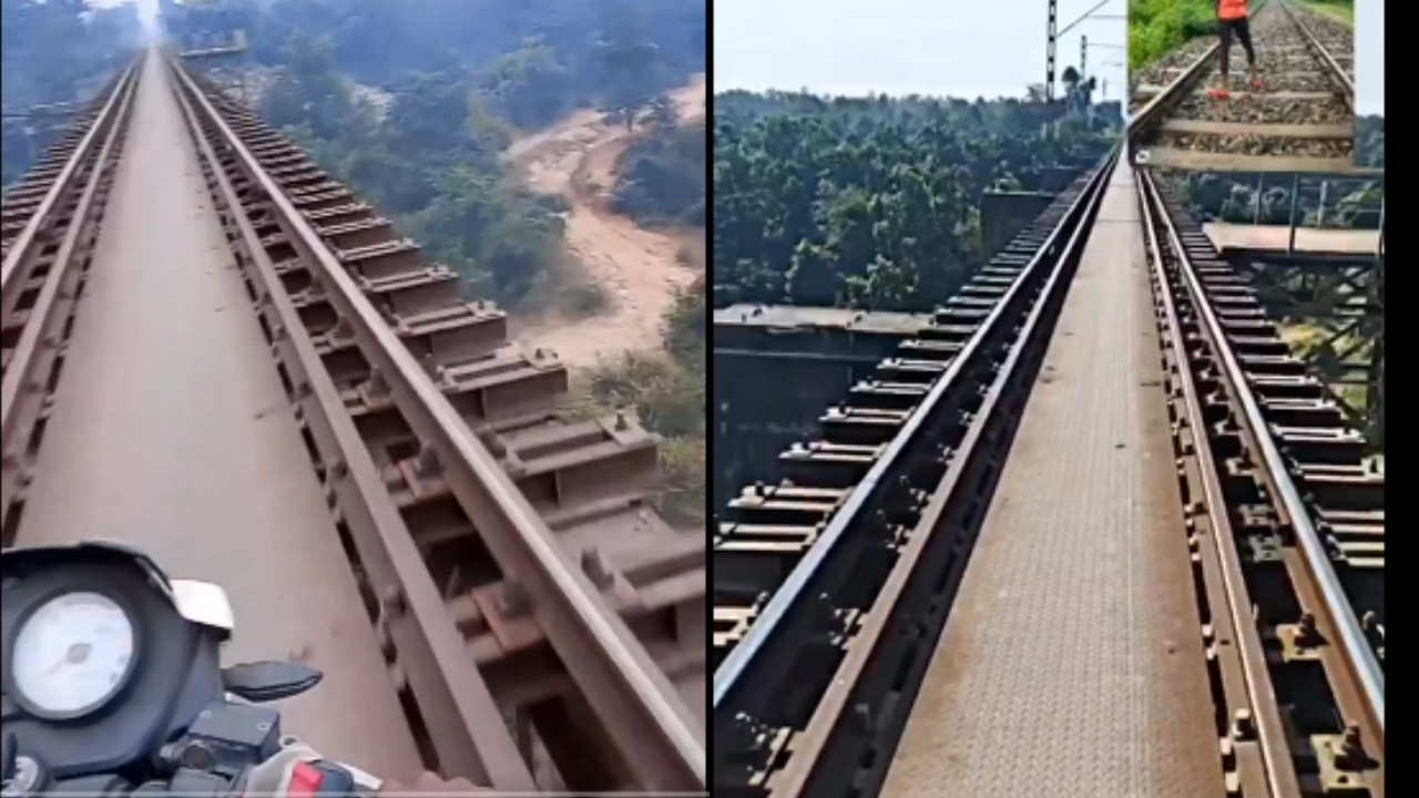 A Guy riding a motorcycle on a railway bridge over a river while making a reel, endangering not only their own life but also the lives of two others. The video appears to be from Jharkhand