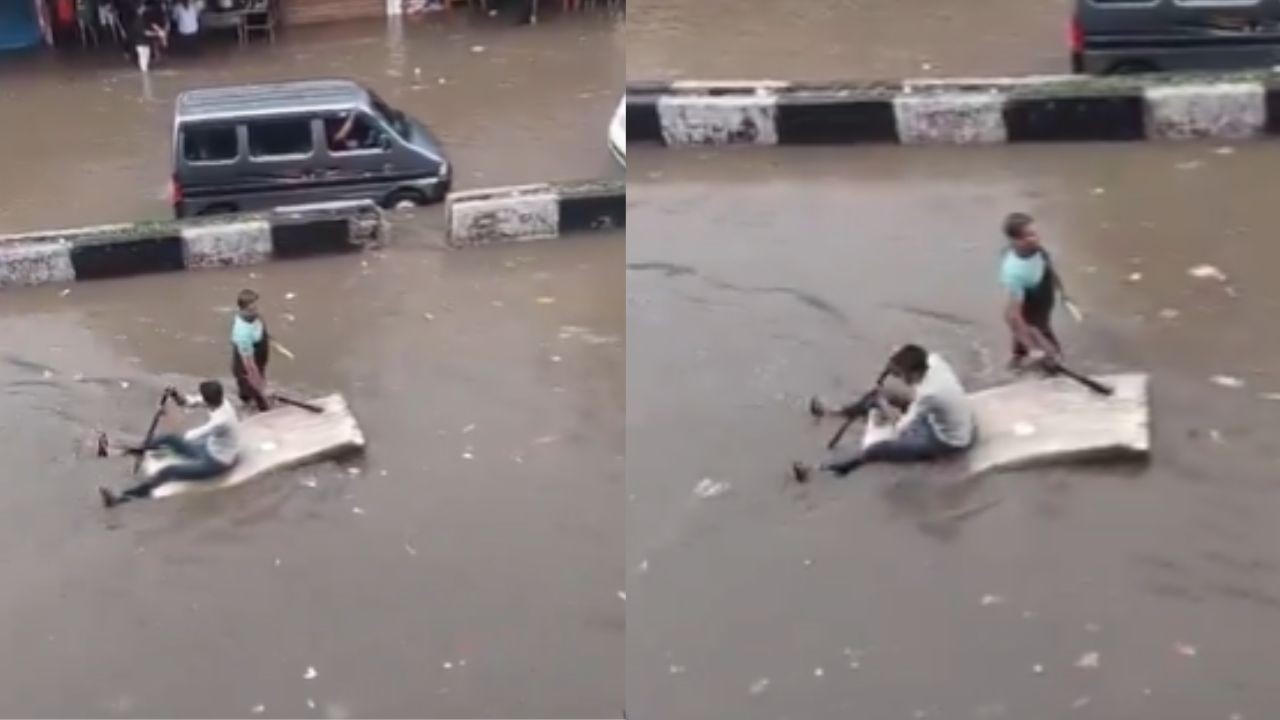 सोशल मीडिया प्लेटफॉर्म एक्स पर एक दिल्ली बारिश का वीडियो पर पोस्ट किया गया हैं. इस वीडियो में दिल्ली रोड पर पानी भरा हुआ नजर आ रहा है. रोड के एक तरफ लोग अपनी गाड़ी चलाने में मुश्किलों का सामना कर रहे हैं वहीं, रोड के दूसरे एक व्यक्ति नाव thermocol से बने नाव का मजा ले रहा है. व्यक्ति ने thermocol पर बैठकर उसे नाव की तरह चला रहा है. इसे आगे बढ़ाने के लिए युवक डंडा का इस्तेमाल कर रहा है.