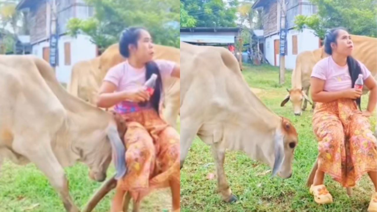 वायरल वीडियो में एक गाय एक महिला को टक्कर मारती नजर आ रही है. इस क्लिप में देखा जा सकता है कि कुछ गाय एक आंगन में चारा खा रही होती हैं. उसी के पास महिला कुर्सी पर बैठी हुई होती है. इस दौरान महिला कोक पीते हुए दिखाई दे रही है. तभी अचानक एक गाय वहां आ जाती है और महिला को जोरदार टक्कर मार देती है जिससे वह दूर जाकर गिरती है.