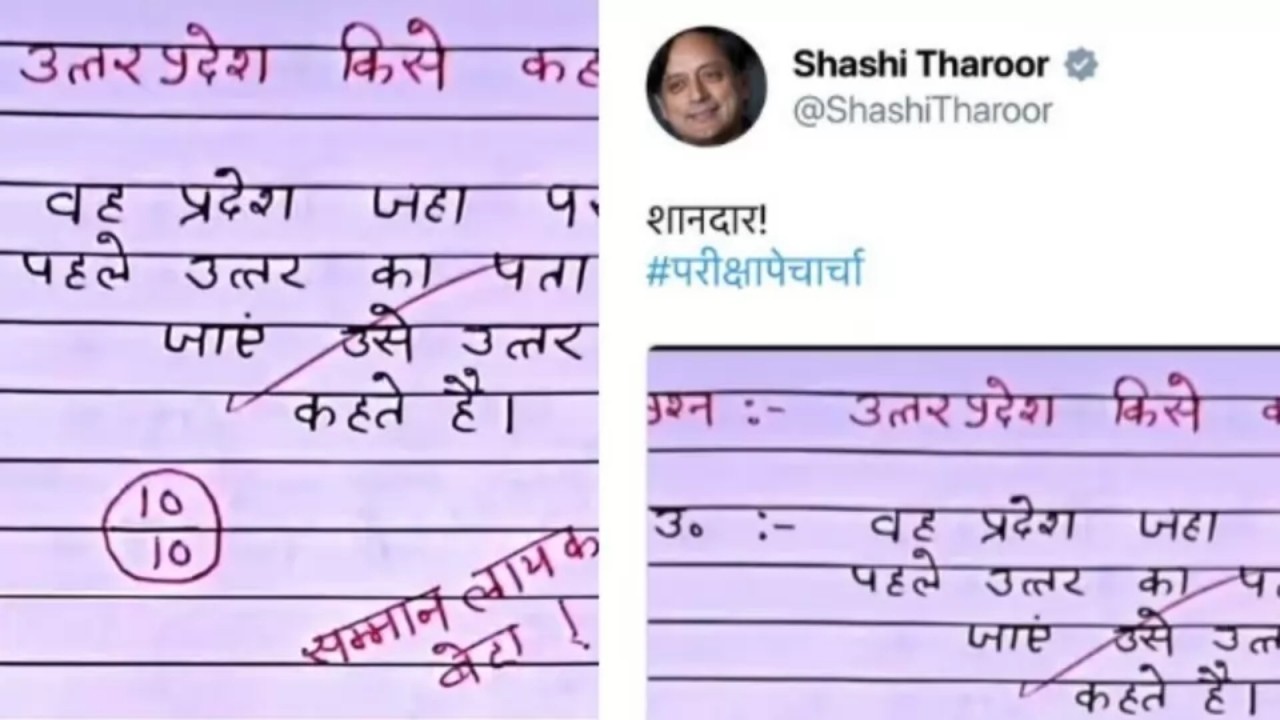 सोशल मीडिया पर वायरल हो रहे पोस्ट में एक सवाल पूछा गया कि उत्तर प्रदेश किसे कहते हैं? इसका जवाब लिखते हुए स्टूडेंट ने लिखा कि ''वह प्रदेश जहां पर परीक्षा से पहले ही उत्तर का पता चल जाए उसे उत्तर प्रदेश कहते हैं.'' ये जवाब पेपर में लिखा देखकर टीचर ने उसे 10 में से 10 नंबर दिए हैं. साथ ही टीचर ने लिखा उसी पेपर पर लिखा कि ''सम्मान लायक हो बेटा.'' इसे शशि थरूर ने भी इसे पोस्ट किया है.